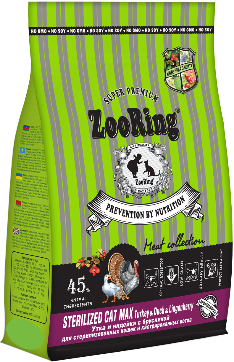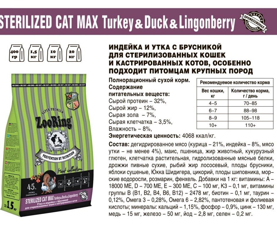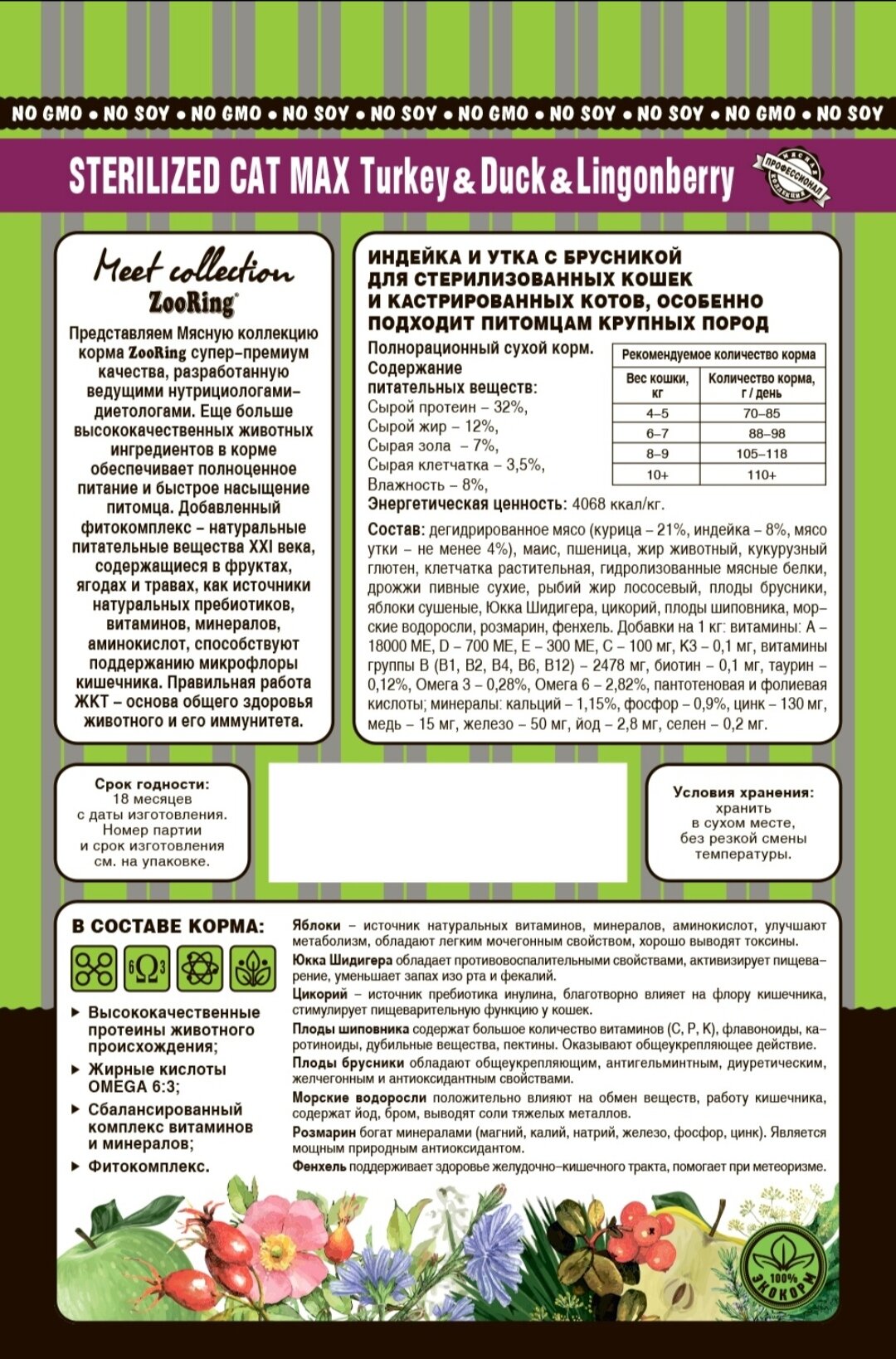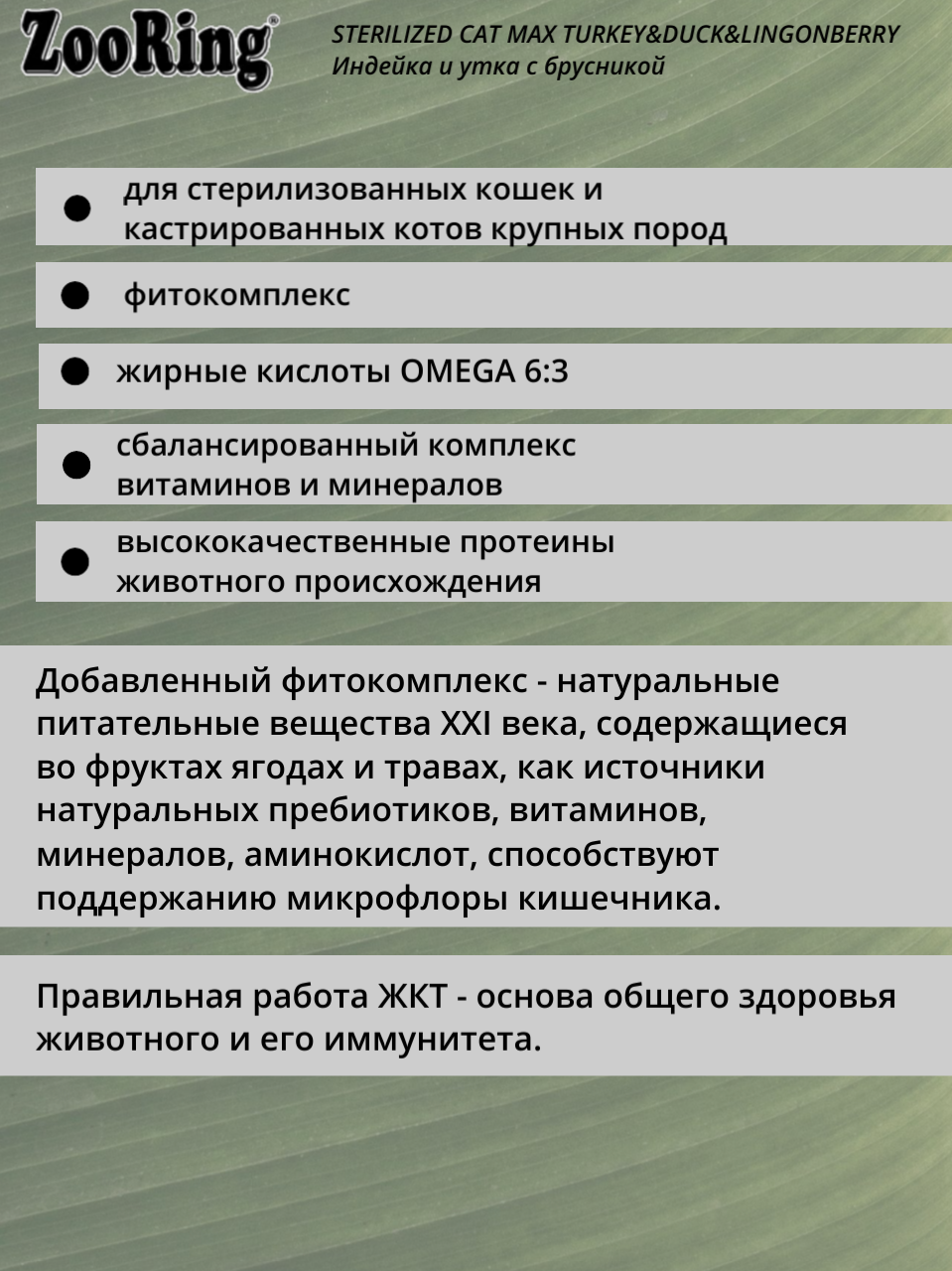 Сухой корм Зооринг / ZooRing Sterilized Cat Max Turkey & Duck & Lingonberry. для стерилизованных кошек, индейка и утка с брусникой, 1,5 кг