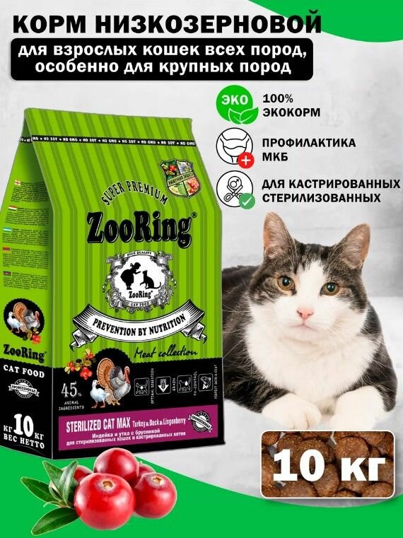 Сухой корм ZooRing Sterilized Max индейка и утка с брусникой для стерилизованных кошек, 10кг
