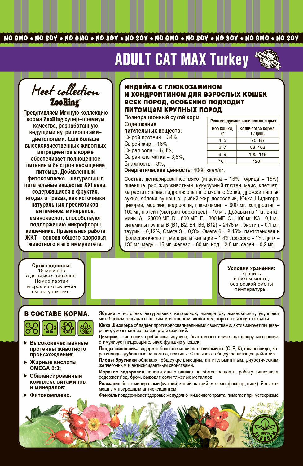 Сухой корм ZooRing ADULT CAT MAX TURKEY Индейка с глюкозамином и хондроитином для кошек, 1,5кг