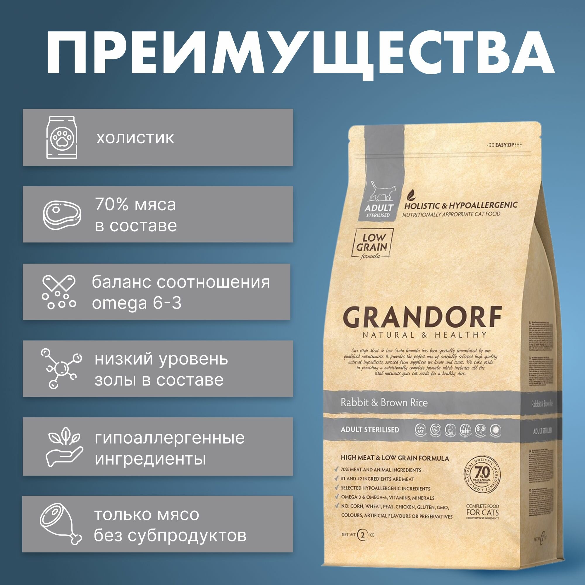 Корм для кошек GRANDORF Кролик с индейкой Sterilised 2кг. Для взрослых стерилизованных или пожилых кошек от 1 года. С пробиотиками, низкозерновой.
