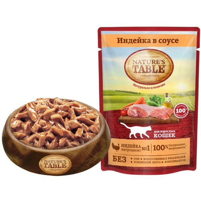 Купить NATURE`S TABLE пауч для кошек (кусочки в соусе) Индейка, 85 г. упаковка 28 шт