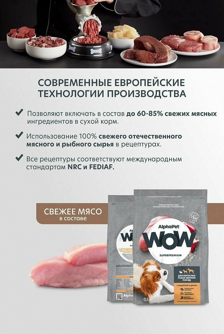 СохранитьALPHAPET WOW SUPERPREMIUM 500 гр сухой корм для взрослых собак мелких пород с индейкой и рисом, 4 уп интересное: