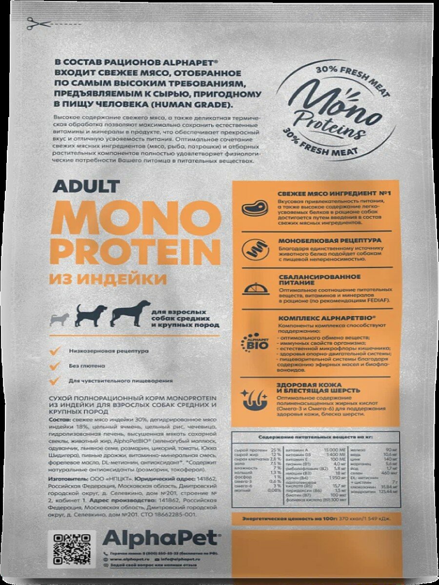 ALPHAPET SUPERPREMIUM MONOPROTEIN Корм для взрослых собак средних и крупных пород с Индейкой