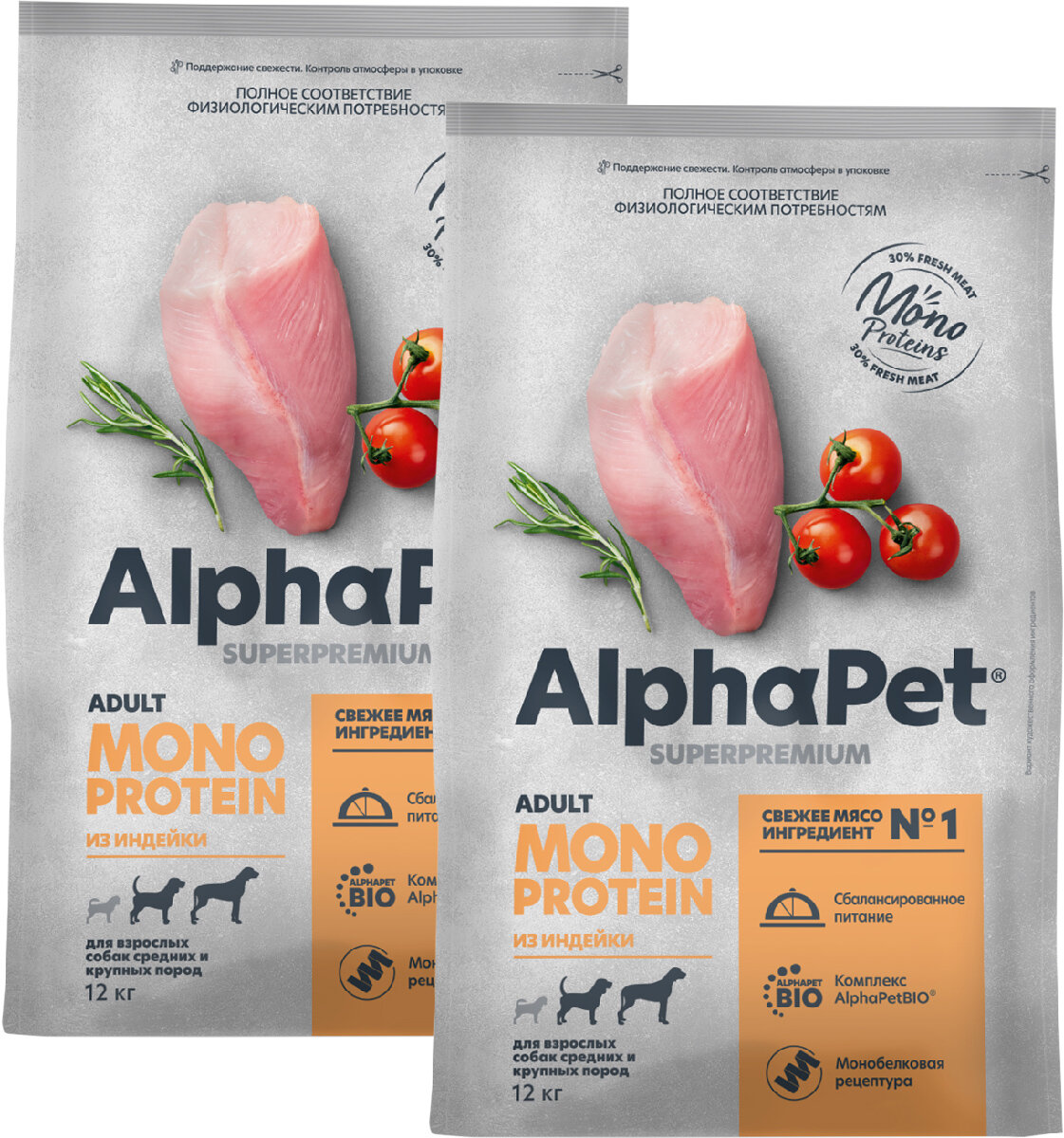 Купить ALPHAPET SUPERPREMIUM MONOPROTEIN монобелковый для взрослых собак средних и крупных пород с индейкой (12 + 12 кг)