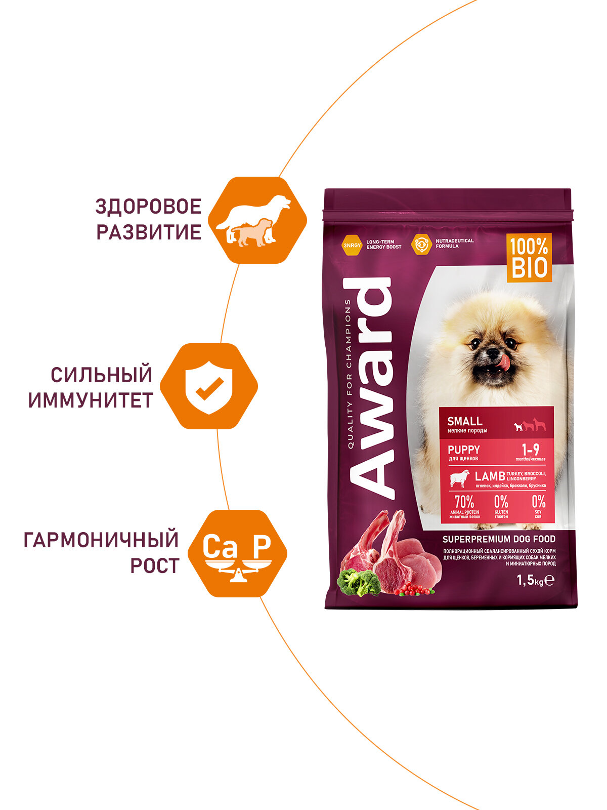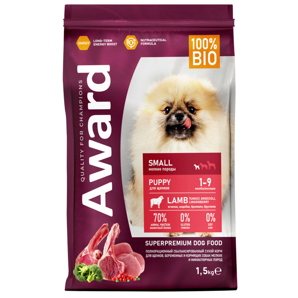 Сухой корм AWARD для щенков от 1 мес, беременных и кормящих сук мелких и мин. пород с ягненком и индейкой с добавлением брокколи и брусники 1,5кг (7173402)