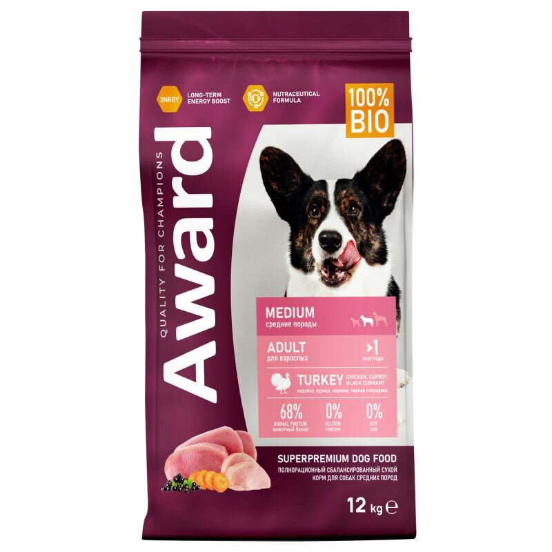Сухой корм AWARD для щенков, беременных и кормящих собак средних пород с индейкой, курицей, морковью и черной смородиной 12кг