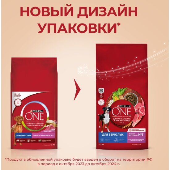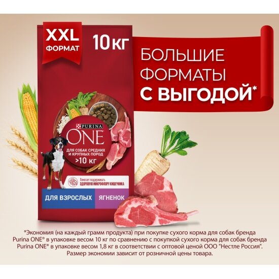 Purina One Корм для взрослых собак средних и крупных пород с ягненком, 10кг 10 кг