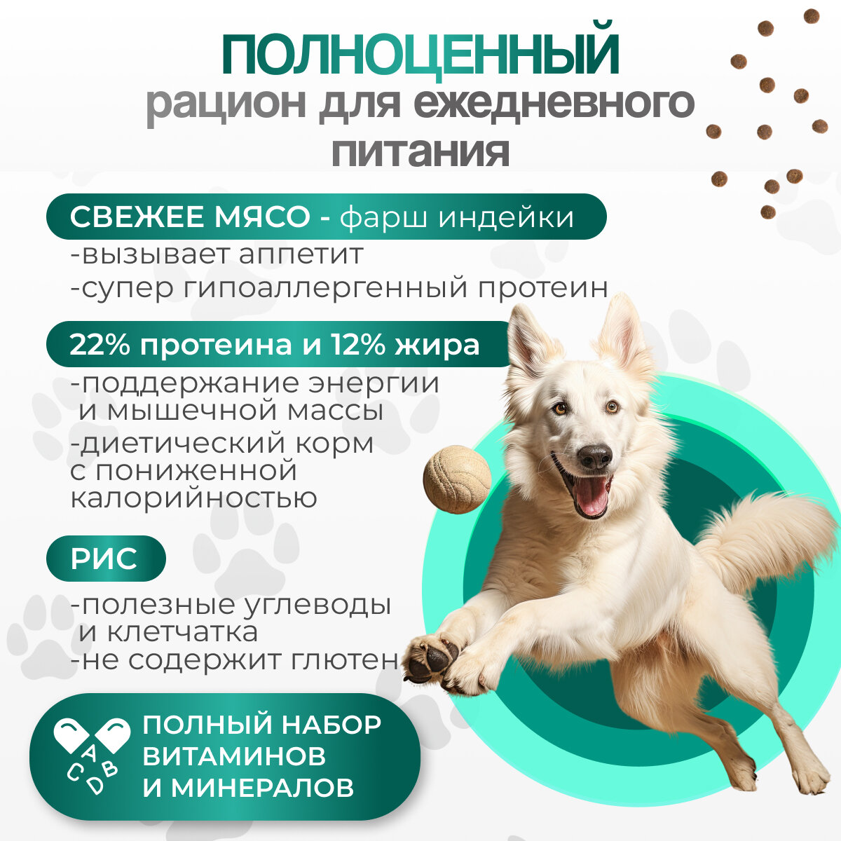 | Особые потребности | гипоаллергенный / для активных животных / для здоровья кожи и блеска шерсти / для здоровья костей и суставов / для снижения запаха стула / при чувствительном пищеварении |