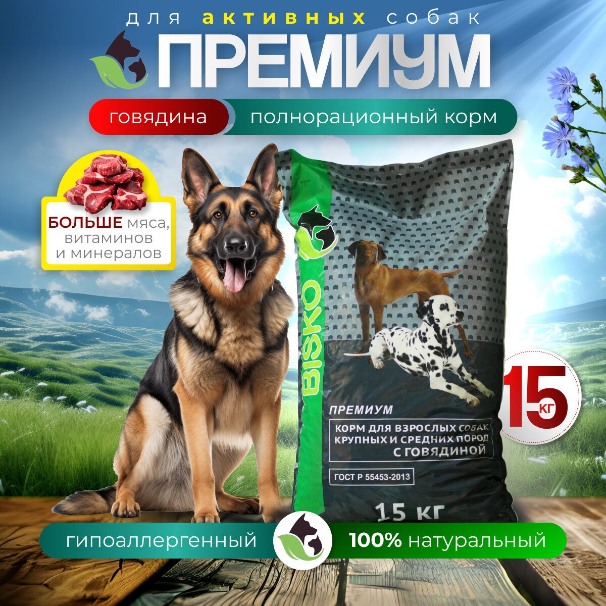 Купить Корм для собак сухой 15 кг Биско Премиум Говядина для крупных и средних пород