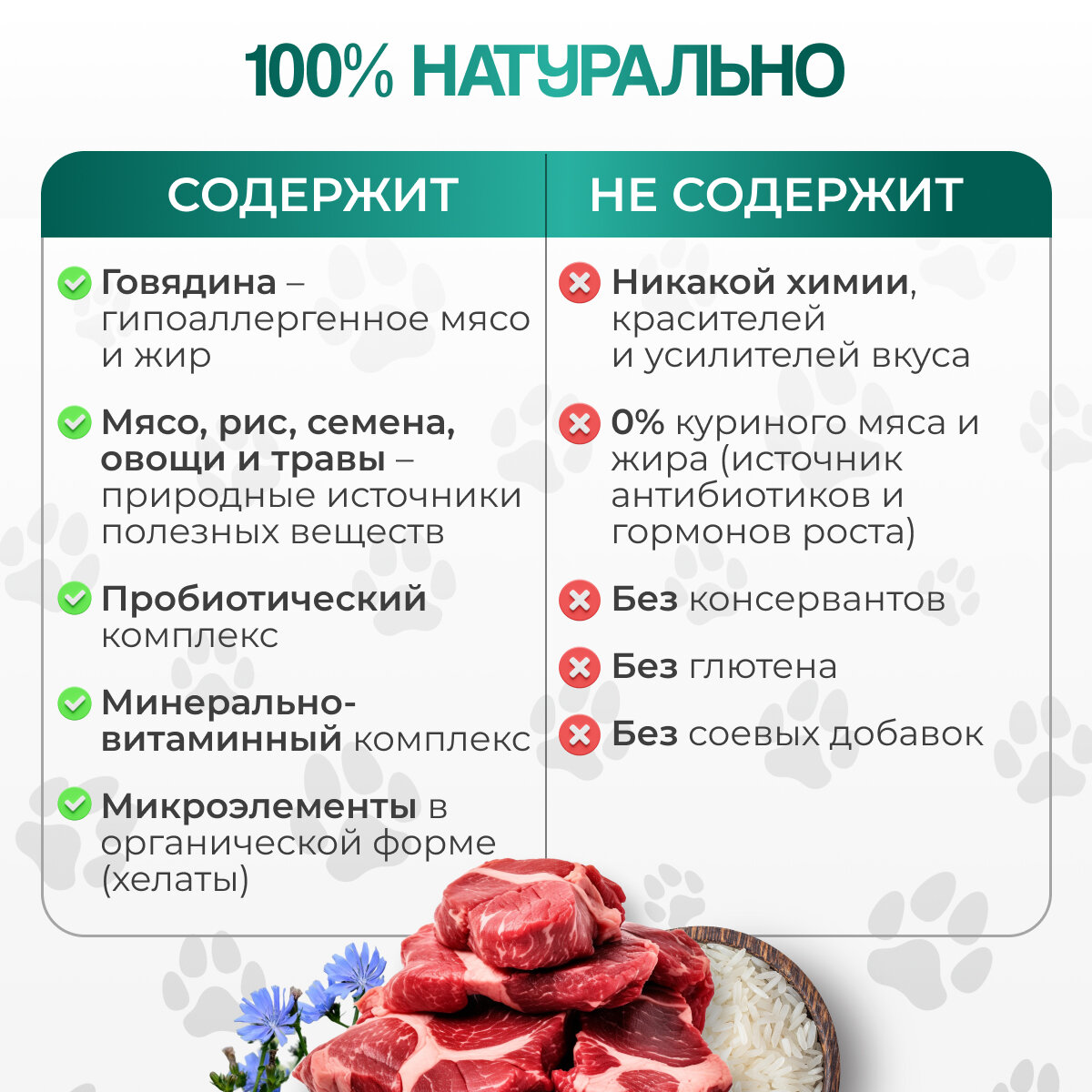 | Особые потребности | гипоаллергенный / для активных животных / для здоровья кожи и блеска шерсти / для здоровья костей и суставов / для снижения запаха стула / при чувствительном пищеварении |