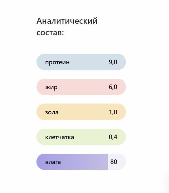 | Пищевая ценность | сырой протеин 9,0 г, сырой жир 6,0 г, сырая зола 1,0 г, сырая клетчатка 0,2 г, влага 80 % |