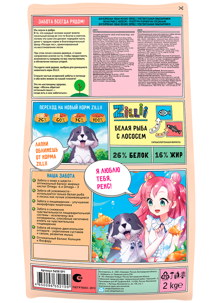 ZILLII Adult Dog Small Breed Sensitive Digestion сухой для взрослых собак мелких пород с чувствительным пищеварением Белая рыба с Лососем 2кг