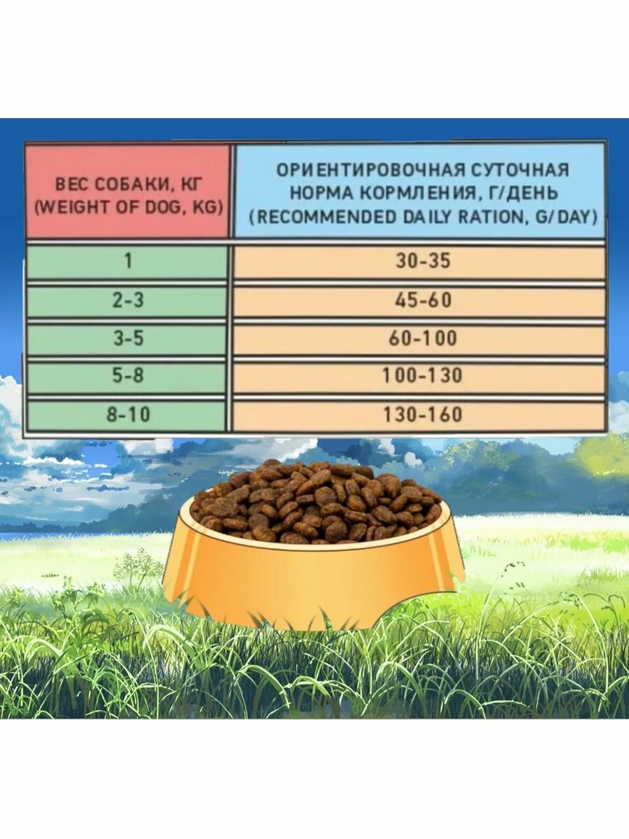| Пищевая ценность | Сырой белок 27%, сырой жир 17%, сырая клетчатка 3.5%, сырая зола 7.5%, влажность 9%, омега-6 2.5%, омега-3 0.61%, кальций 1.5%, фосфор 1.2%. |