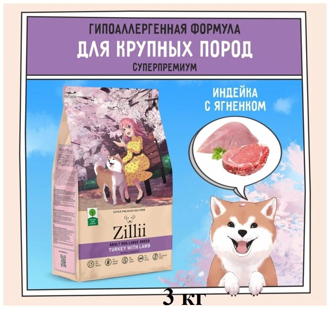 Корм сухой для собак крупных пород 3 кг, гипоаллергенный ZILLII (Зилли), Индейка с Ягнёнком