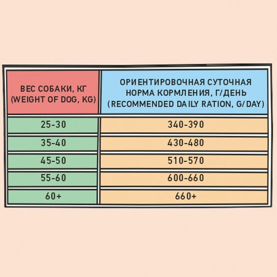 | Пищевая ценность | Сырой белок 27%, сырой жир 17%, сырая клетчатка 3.5%, сырая зола 7.5%, влажность 9%, омега-6 2.5%, омега-3 0.61%, кальций 1.5%, фосфор 1.2%. |
