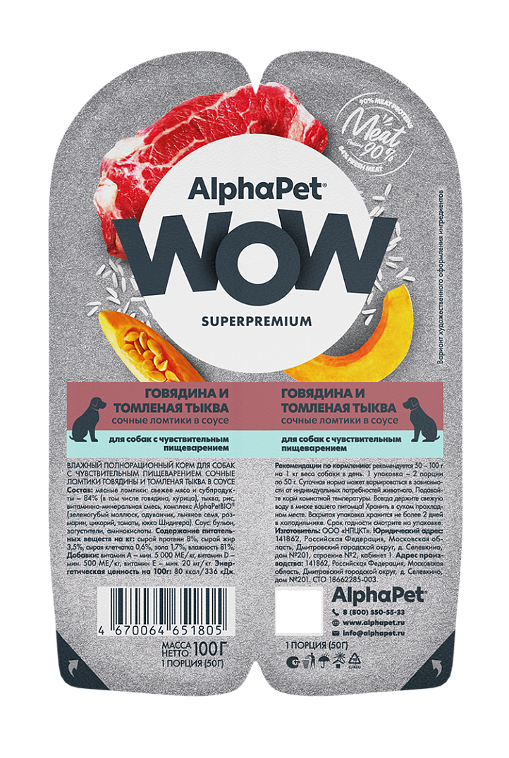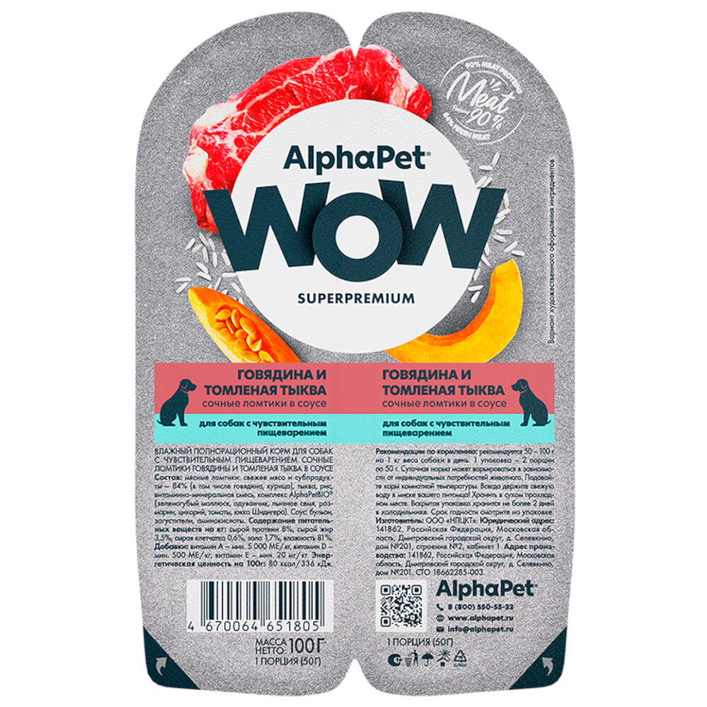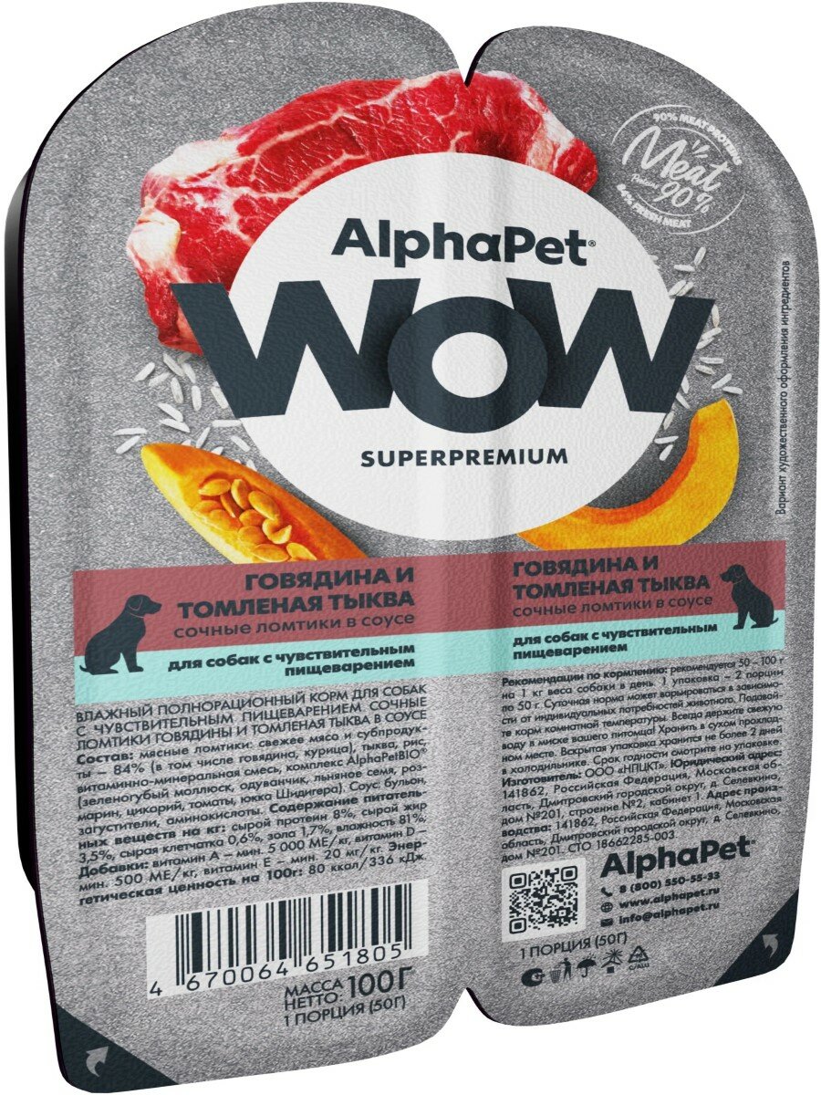 Купить Влажный корм Альфа Пет WOW для собак с чувств. пищ. ломтики в соусе Говядина и томленая тыква 100г
