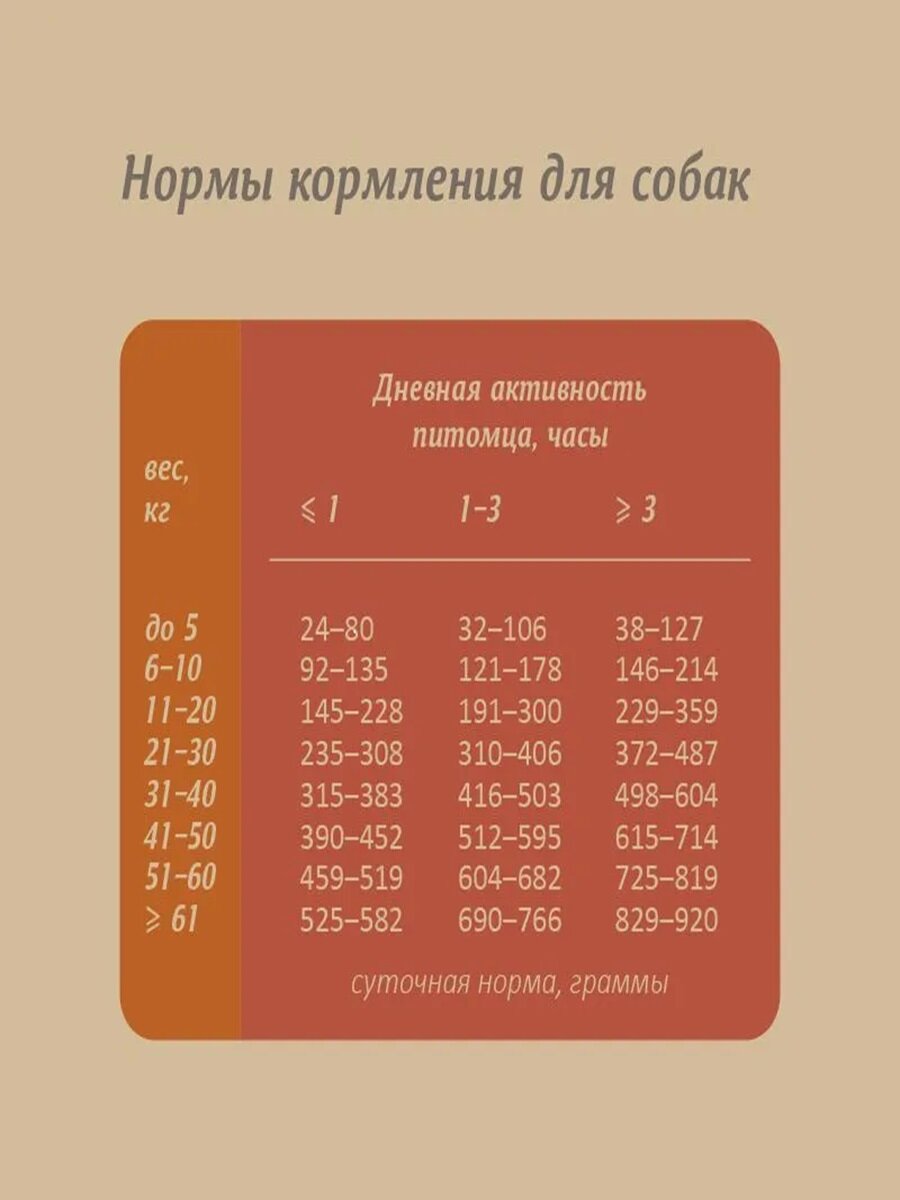 | Дозировка | Суточная норма (г) при активности: Вес собаки 5 кг-менее 1 часа:28-93 г; 1-3 часа : 37-123г. ; более 3 часов: 44-147г.; Вес собаки 6-10-менее 1 часа:107-157г;1-3 часа : 141-206; более 3 часов;169-247г. |