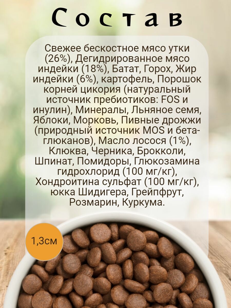 Беззерновой корм с живыми пробиотиками: свежее мясо утки с бататом для собак средних и крупных пород, 10кг.