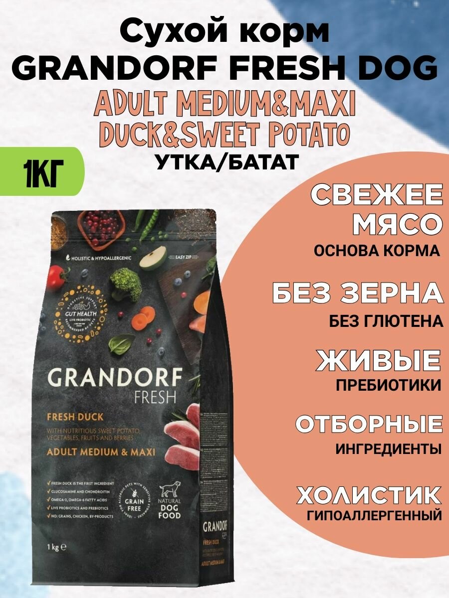Сухой корм GRANDORF Fresh, свежее мясо утки с бататом для собак средних и крупных пород (1 кг)