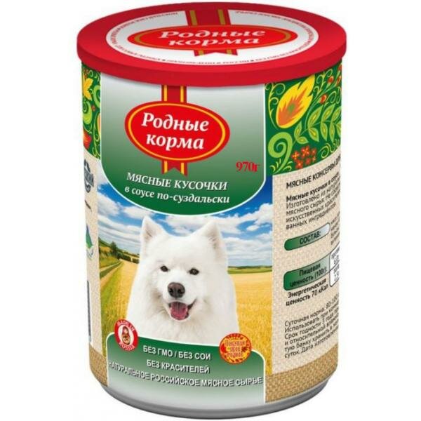 Корм влажный Родные для собак Мясные кусочки по-Суздальски консервы 970 гр