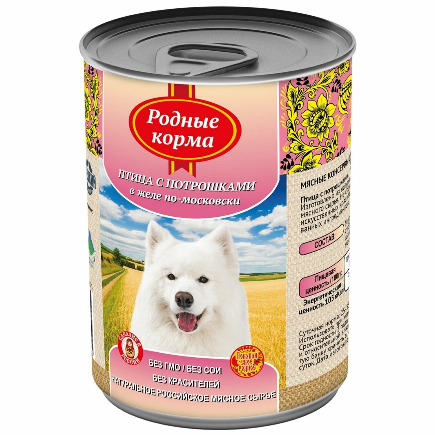 Корм влажный Родные для собак Птица с потрошками по-Московски консервы 970 гр