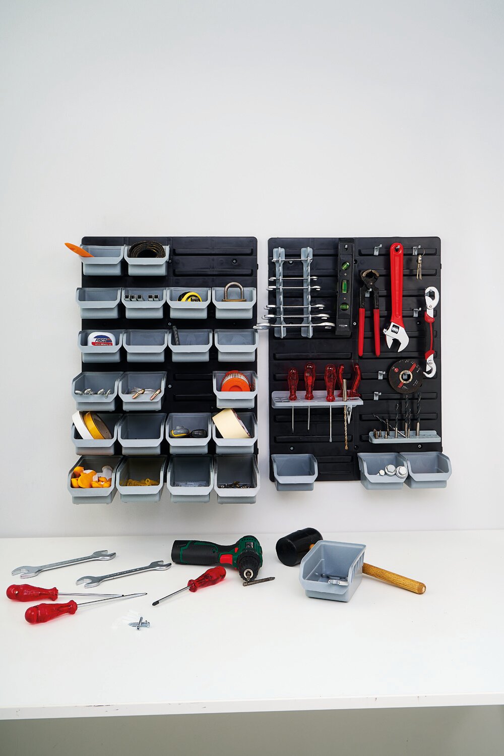 | Подробная комплектация | В комплект входят: настенные панели, размер 42*59*2 см - 2 шт.; лотки для метизов: малый - 16 шт., (11,5*10,0*7,4 см); средний - 8 шт.,(16,5*10,0*7,4 см); большой - 4 шт. (21,0*10,0*7,4 см); кронштейны 10 шт.; держатель-органайзер для инструмента - 1 шт.; комплект кронштейн-держателя для ключей - 1 шт.; держатель-органайзер для дрелей и наконечников отверток -1 шт. |