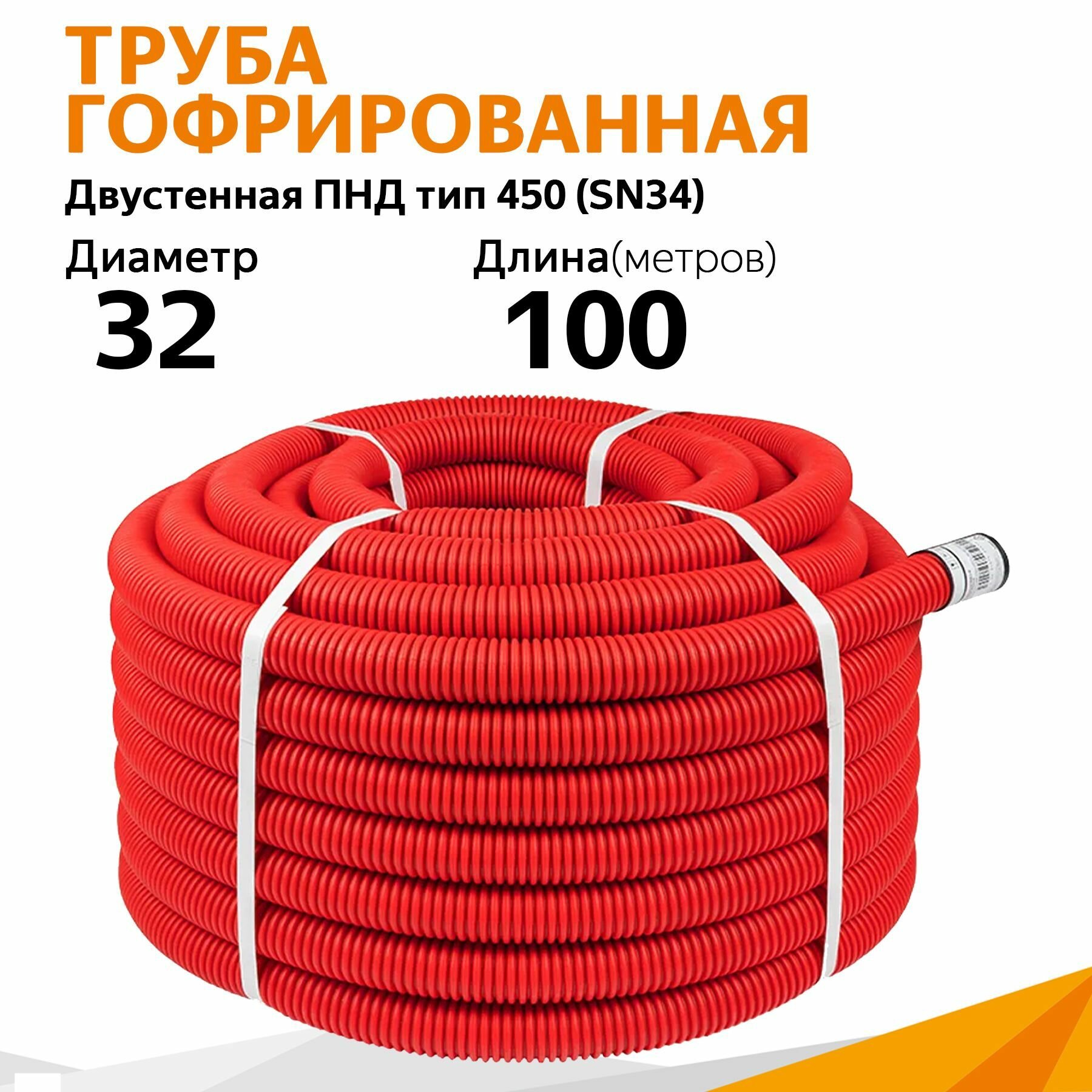 Купить Труба гофрированная двустенная ПНД гибкая тип 450 (SN34) с/з красная д32 мм (100м/уп) Промрукав