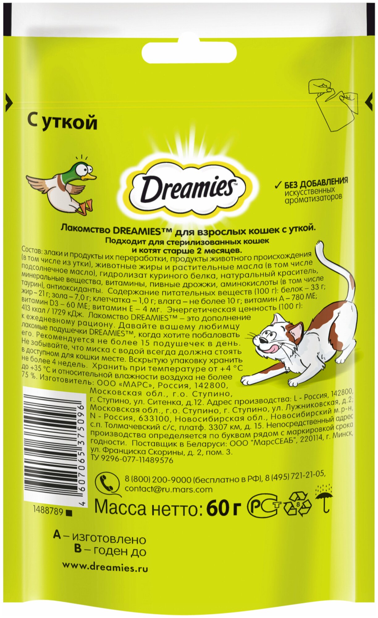 Лакомство для кошек DREAMIES лакомые подушечки с уткой, 60гр