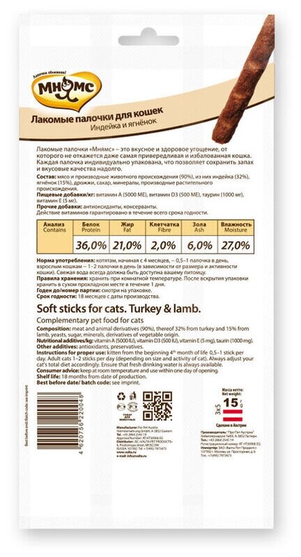 Мнямс лакомые палочки 13,5 см для кошек 3х5 г из индейки и ягненка NEW