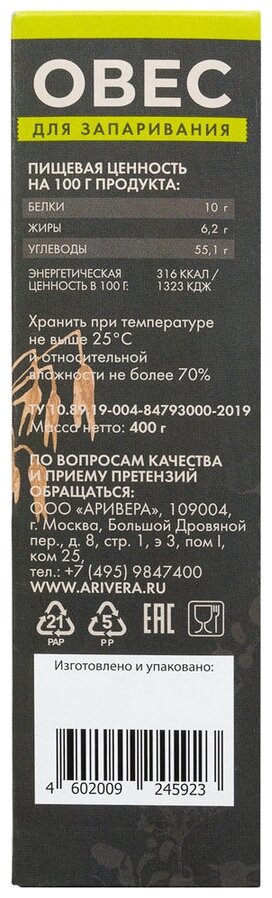 Ниже Вы можете прочитать отзывы на Овес Arivera био для запаривания 400 г, ознакомится с подробными характеристиками, посмотреть интересные обзоры и фотографии на Овес Arivera био для запаривания 400 г.