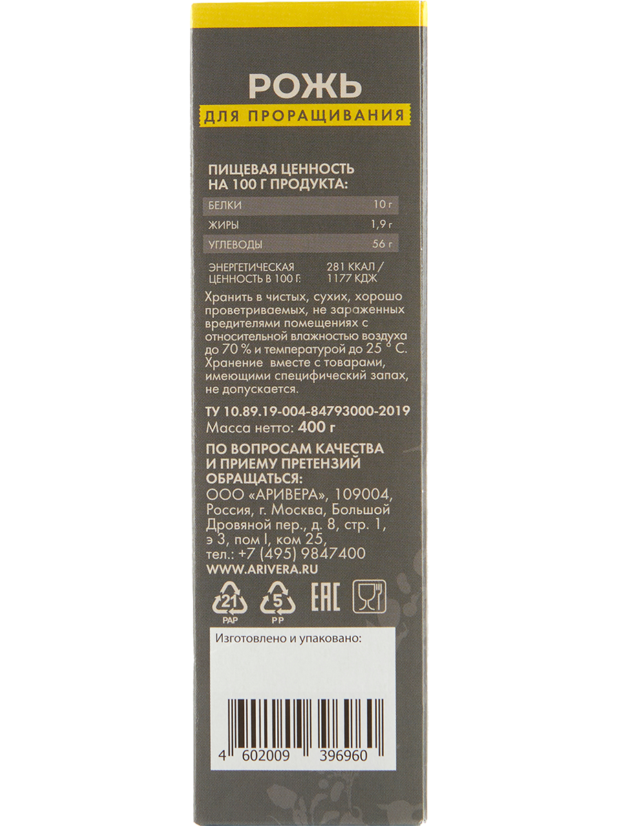 Аривера Рожь для проращивания 400 г, полимерн. пакет+карт.коробка интересное: