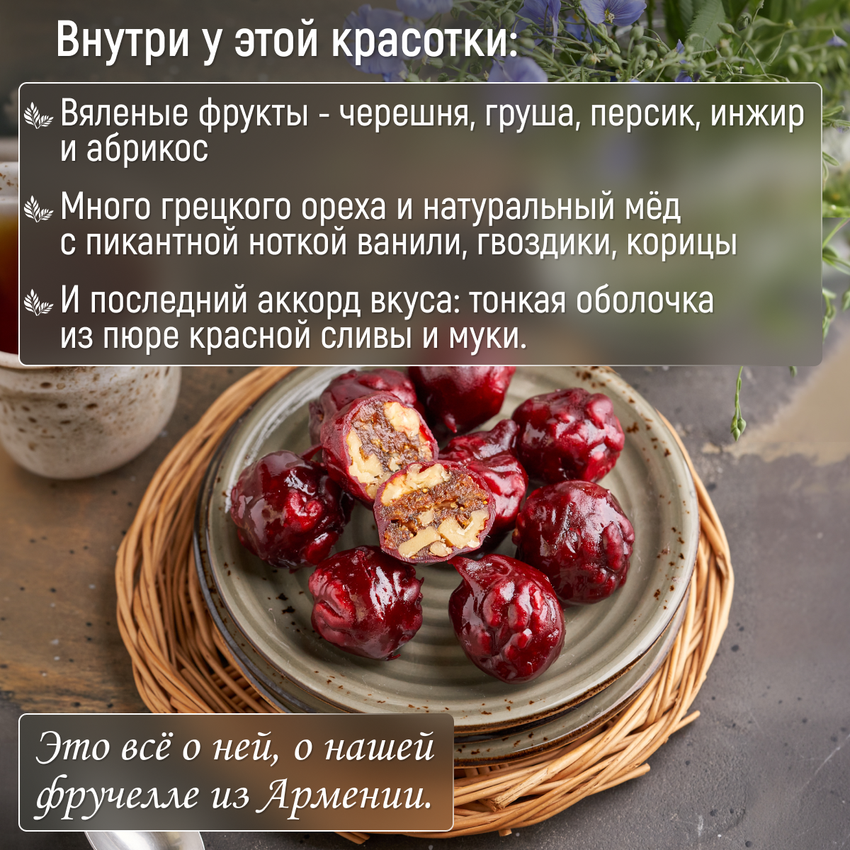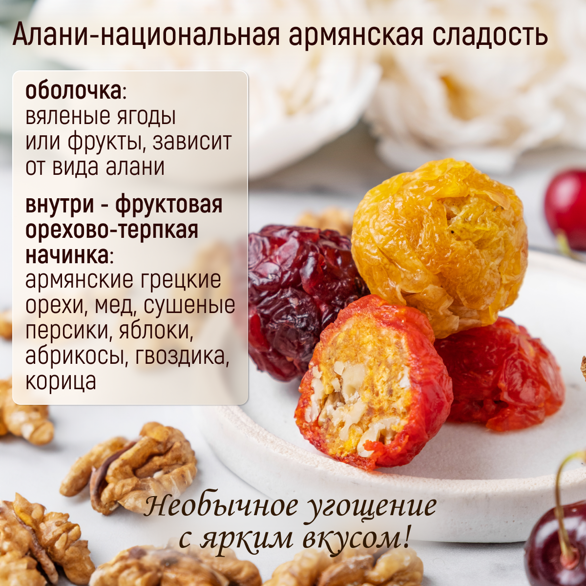 | Состав | алани с вишней, черешней красной/желтой, арбузом (абрикос, яблоко, персик, грецкий орех, мед, корица, гвоздика). конфета абрикос/яблоко, или дыня/груша, или персик/чернослив (абрикос, яблоко, персик, чернослив, дыня, груша, красная слива, малина, стружка кокоса, семена чиа, семена тыквы, натуральный мед, миндаль, кешью, грецкий орех, возможны следы арахиса.), грецкий орех цукат (грецкий орех в скорлупе, сахар),клубника цукат (клубника, сахар песок), миндаль в черешне и вишне (миндаль, черешня, вишня, сахар песок), фручелла (груша, абрикос, персик, инжир, черешня, орех грецкий, мед, сок (пюре) красной сливы, мука, корица, гвоздика, ваниль. (Осторожно, могут попадаться фрагменты скорлупы), манго, драгон фрукт, персик, яблоко, фруктовые чипсы арбуз, хурма, киви |