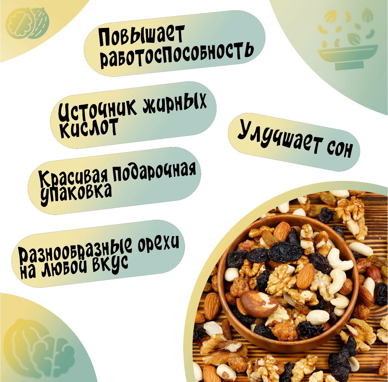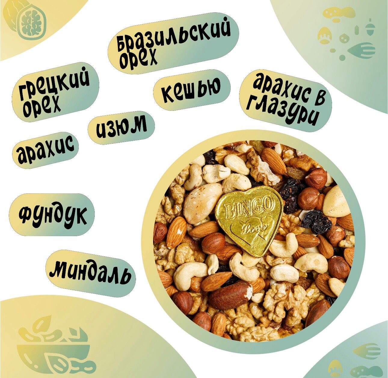 | Состав | изюм (виноград сушенный, подсолнечное масло), жареные ядра орехов: миндаля, фундука, кешью |