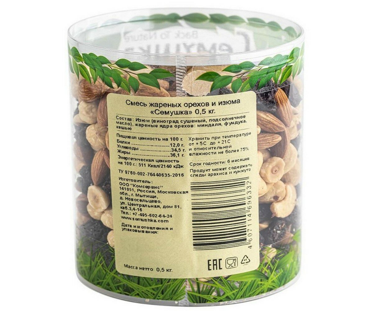 Коктейль Семушка смесь жареных орехов и изюма,тубус, 500г интересное: