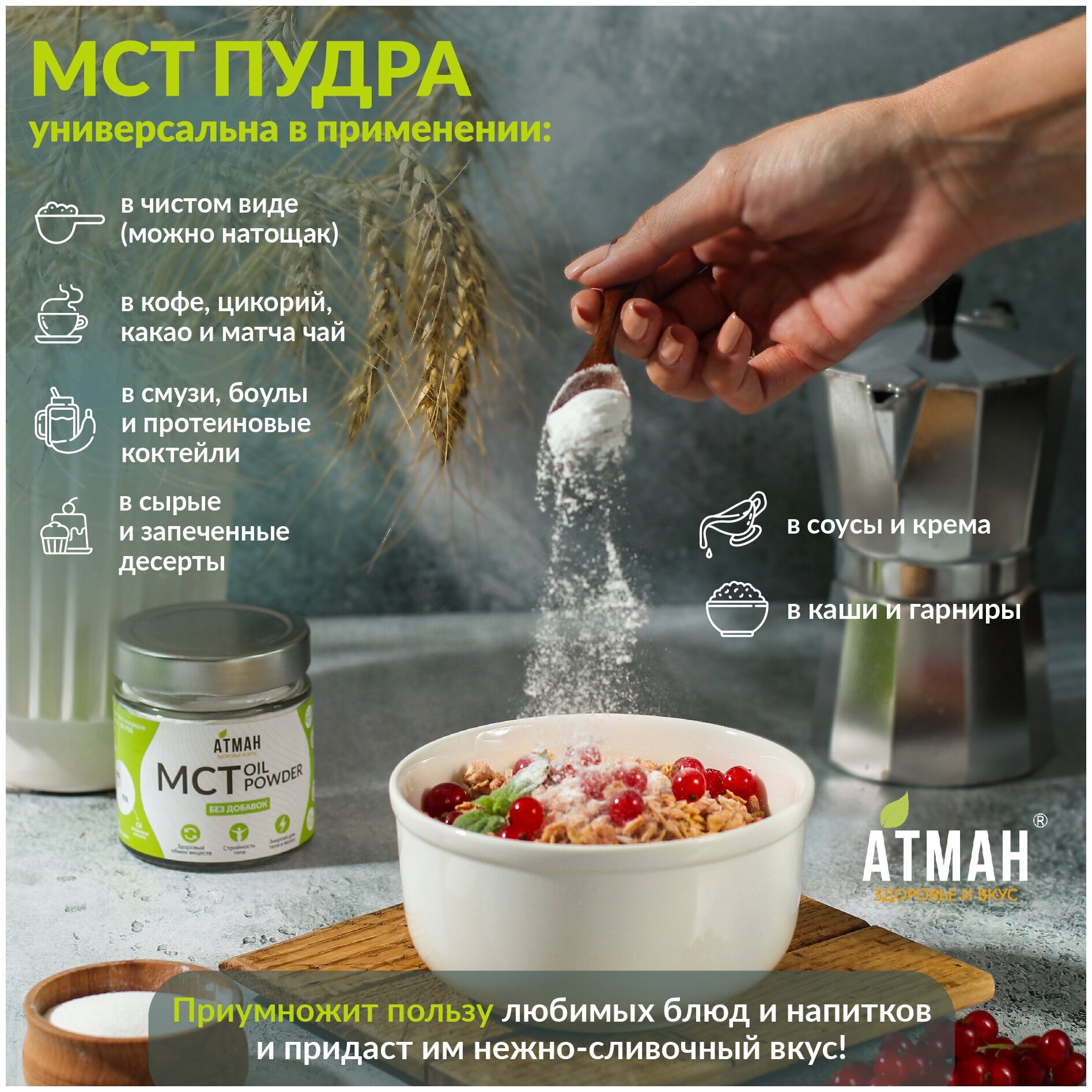 МСТ пудра, МСТ порошок С8, С10, MCT oil, кето продукты, продукты для похудения, правильное питание, 100 гр, АТМАН интересное: