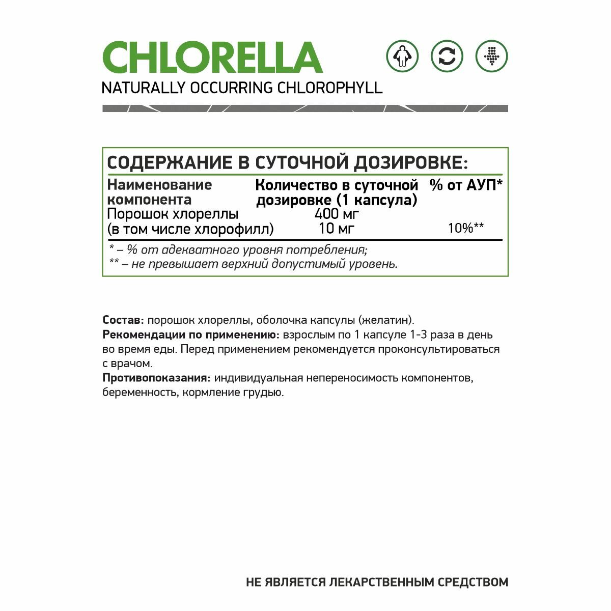 | Состав | порошок хлореллы, оболочка капсулы (желатин) |