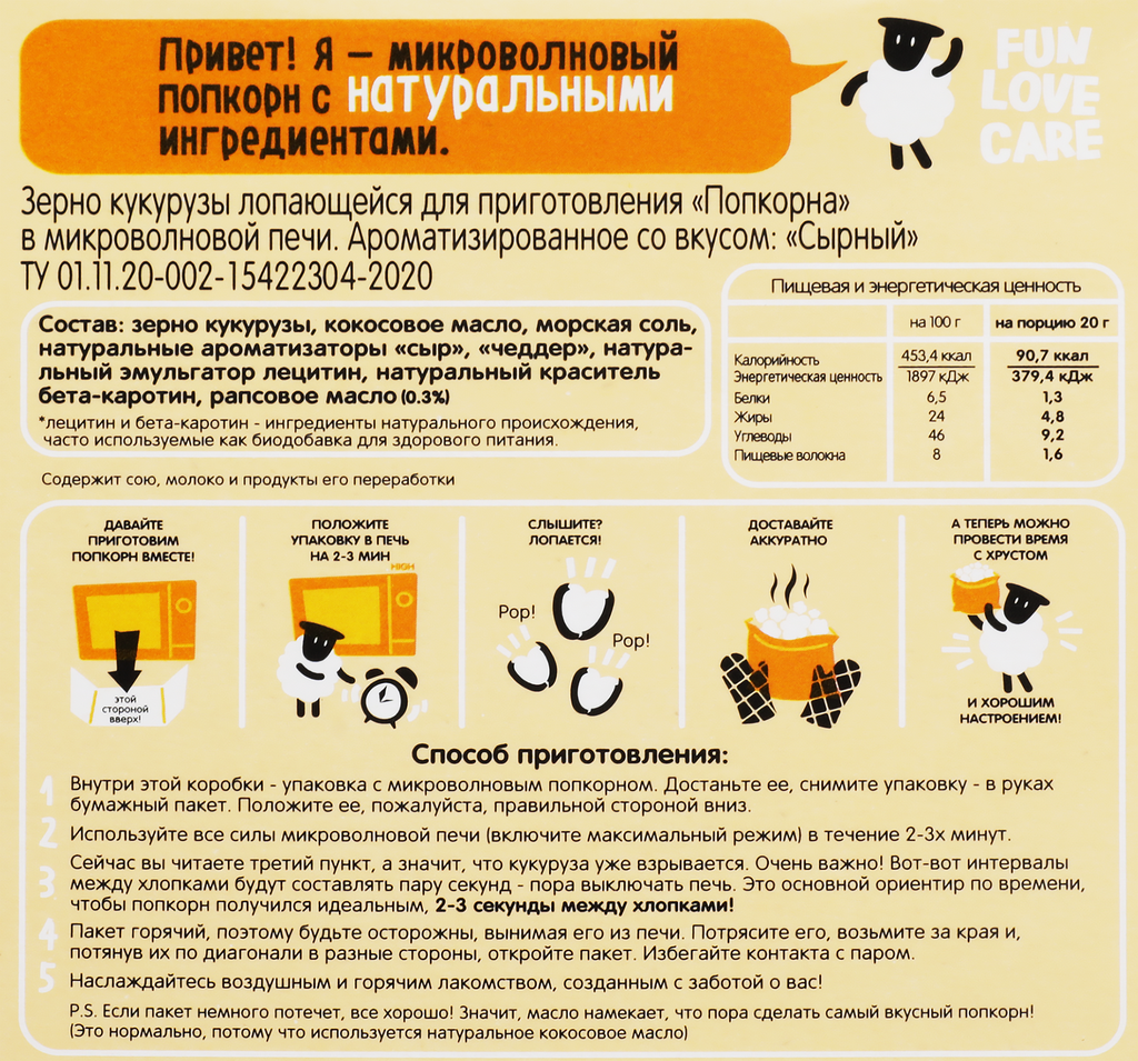 | Состав | зерно кукурузы, кокосовое масло, морская соль, натуральные ароматизаторы «сыр», «чеддер», натуральный эмульгатор лецитин, натуральный краситель бета-каротин, рапсовое масло |