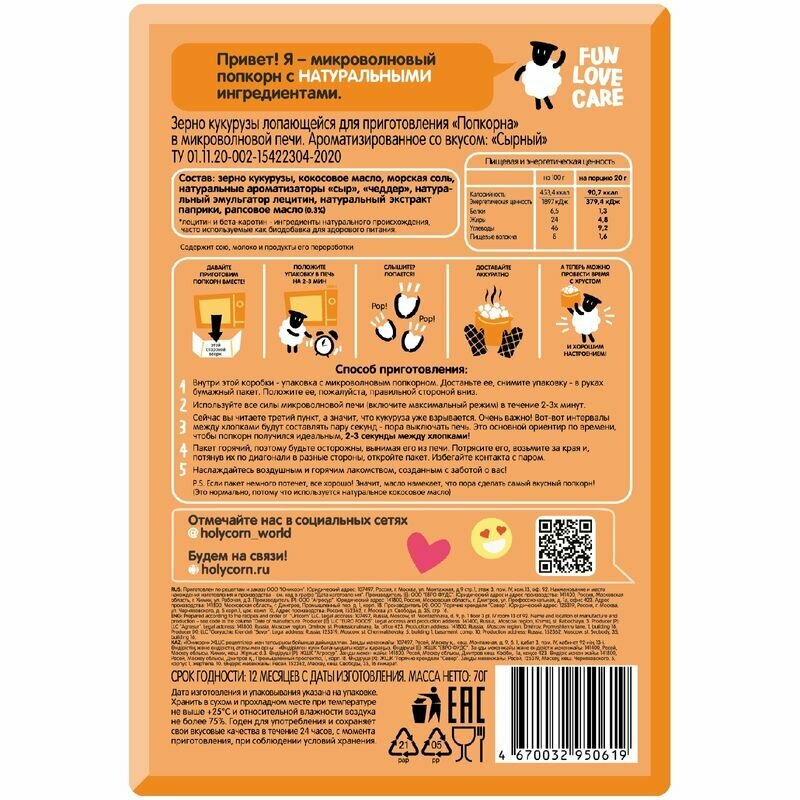 Попкорн для СВЧ, Holy Corn, Нежный сыр, 70 грамм, интересное: