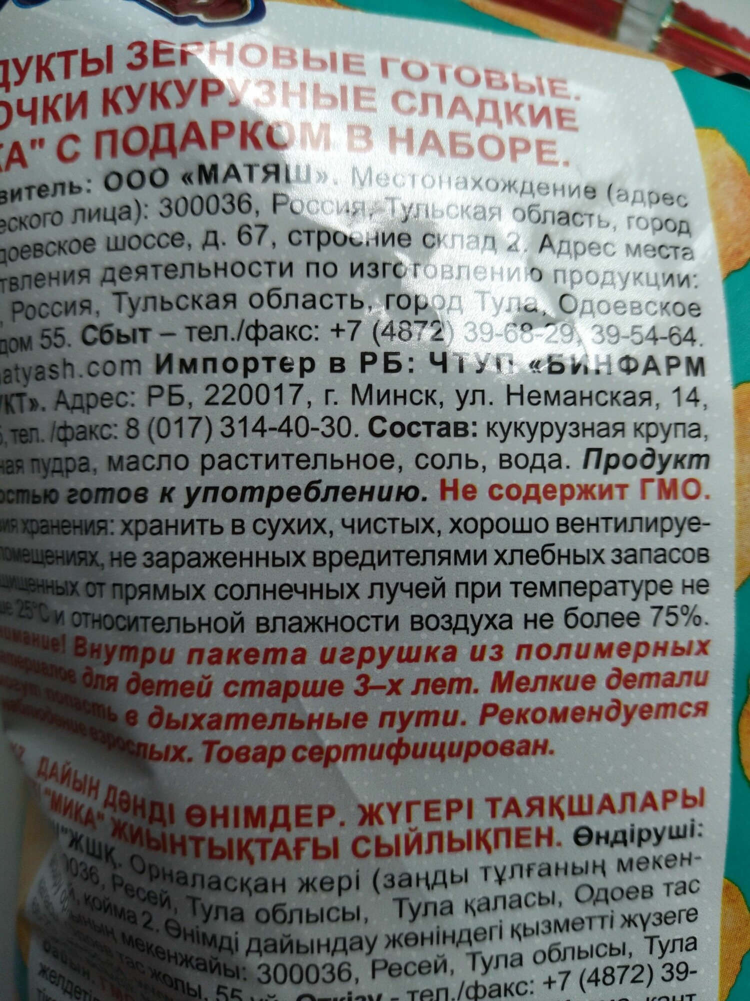 | Состав | Кукурузная крупа, сахарная пудра, масло растительное, соль, вода. |