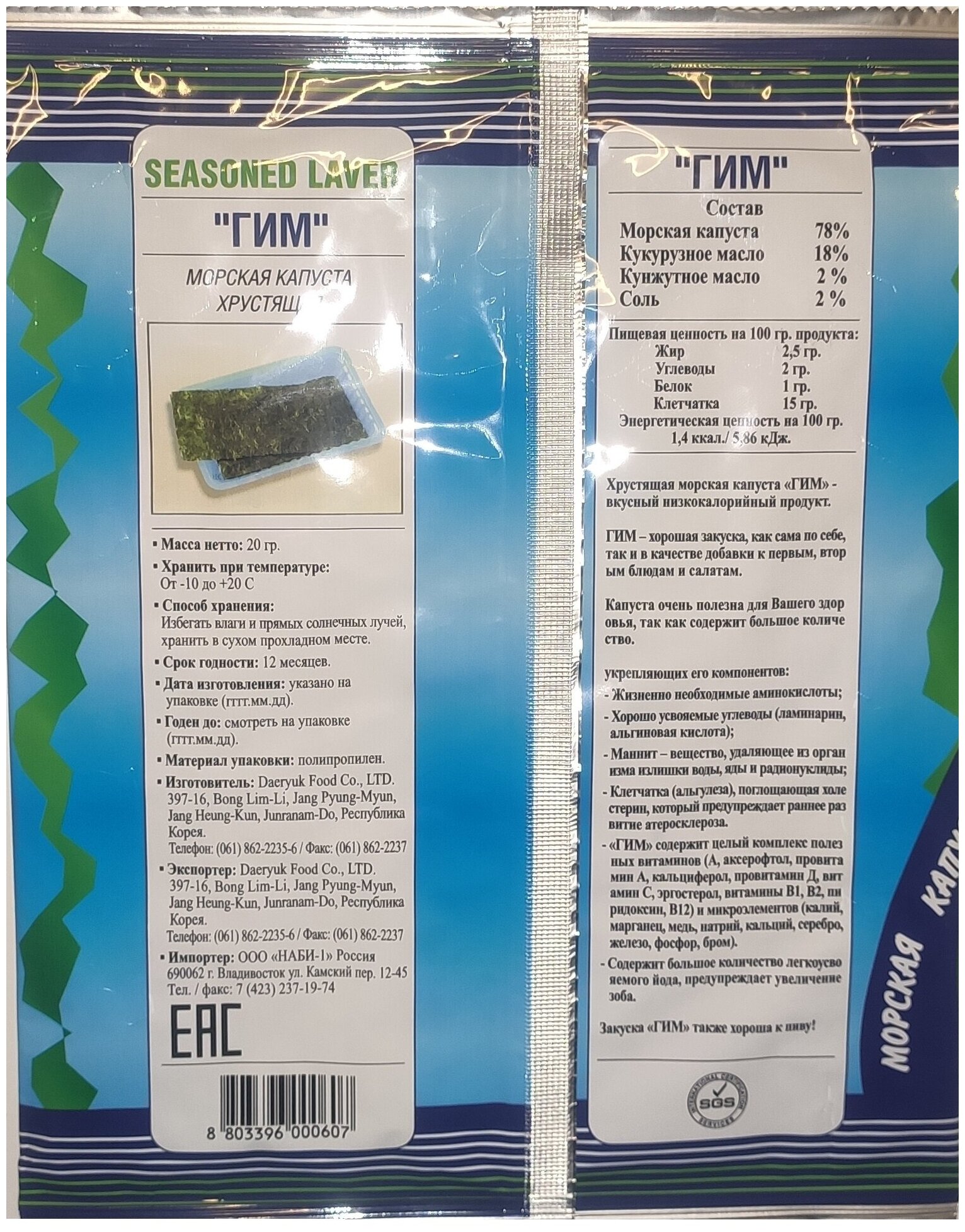 | Состав | Морская капуста 78% Кукурузное масло 18% Кунжутное масло 2% Соль 2%. |
