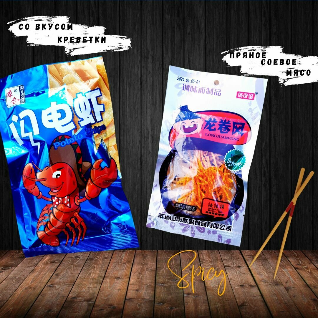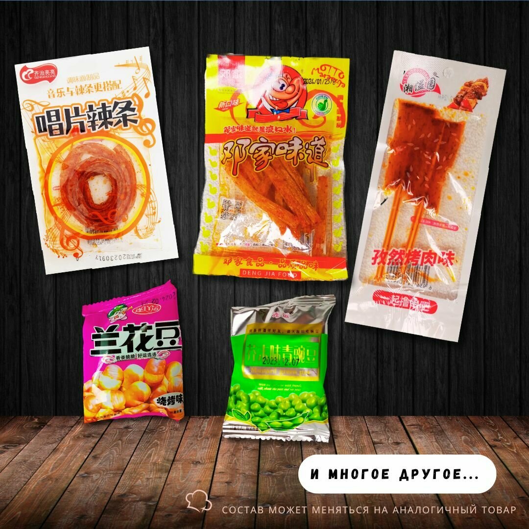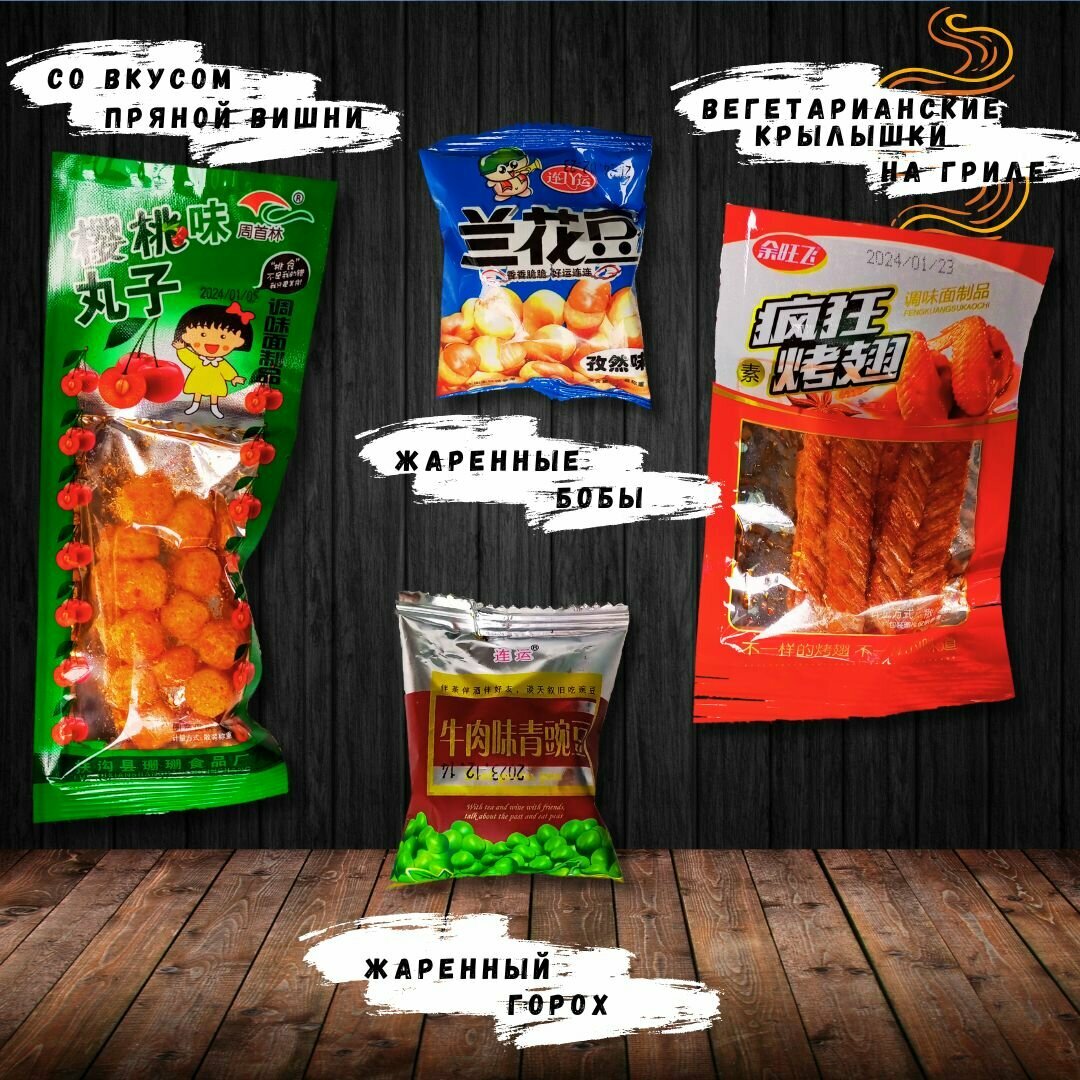 | Состав | Набор азиатских закусок включает 15 различных видов, среди которых: - Азиатские чипсы со сладко-острым вкусом. - Жареный горох и бобы со вкусом горчицы и говядины. - Вегетарианские соевые закуски со вкусом креветки, рыбы, лобстера, говядины и курицы. Состав закусок может меняться. |