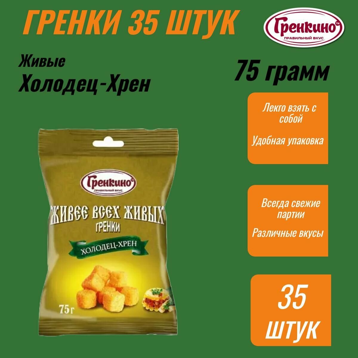 Гренки 35 штук по 75 грамм Сухарики живые снеки "Холодец с хреном" ТМ "гренкино" интересное: