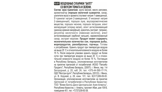 | Состав | мука пшеничная хлебопекарная, крупа манная, растительное масло, ароматизатор [порошок молочной сыворотки, соль, сахар, усилители вкуса и аромата (глутамат натрия 1-замещенный, 5’-гуанилат натрия 2-замещенный, 5’-инозинат натрия 2-замещенный), порошок лука, вкусоароматические вещества, порошок чеснока, порошок петрушки, агент желирующий (хлорид калия), агент антислеживающий (диоксид кремния аморфный), краситель (экстракт паприки), регулятор кислотности (лимонная кислота)], сахар, агент антислеживающий (карбонат кальция), карамелизованный сахар, экстракт моркови |