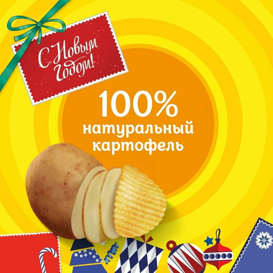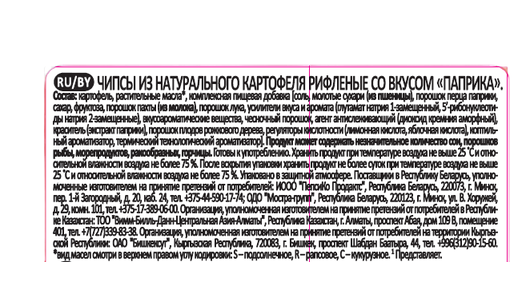 | Состав | картофель, растительное масло, ароматизаторы (соль, молотые сухари (содержат пшеницу), порошок перца паприки, сахар, фруктоза, порошок пахты (из молока), порошок лука, усилители вкуса и аромата (глутамат натрия 1-замещенный, 5-рибонуклеотиды натрия 2-замещенные), вкусоароматические вещества, чесночный порошок, агент антислеживающий (диоксид кремния аморфный), краситель (экстракт паприки), порошок плодов рожкового дерева, регуляторы кислотности (лимонная кислота, яблочная кислота), коптильный ароматизатор, термический технологический ароматизатор |