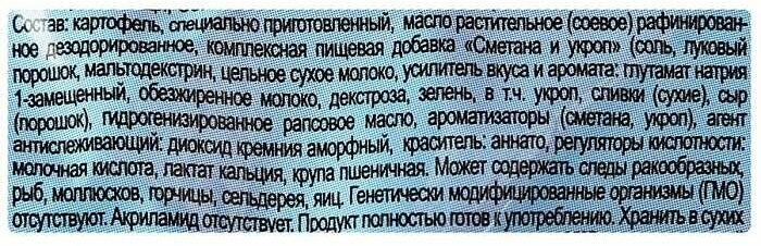 | Состав | картофель, специально приготовленный, масло растительное (соевое) рафинированное дезодорированное, комплексная пищевая добавка «Сметана и укроп» (соль, луковый порошок, мальтодекстрин, цельное сухое молоко, усилитель вкуса и аромата: глутамат натрия 1-замещенный, обезжиренное молоко, декстроза, зелень в т.ч. укроп, сметана (порошок), сыр (порошок), гидрогенизированное рапсовое масло, ароматизаторы, агент антислеживающий: диоксид кремния аморфный, краситель: экстракт паприки, регуляторы кислотности: молочная кислота, лактат кальция, крупа пшеничная |