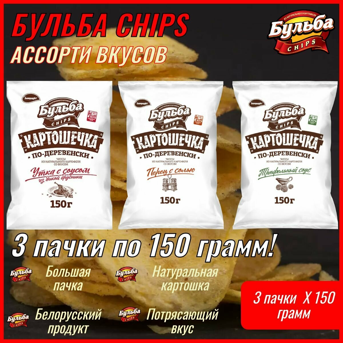 Ниже Вы можете прочитать отзывы на Чипсы Бульба CHIPS Картошечка по-Деревенски ассорти 3 шт по 150грамм, ознакомится с подробными характеристиками, посмотреть интересные обзоры и фотографии на Чипсы Бульба CHIPS Картошечка по-Деревенски ассорти 3 шт по 150грамм.
