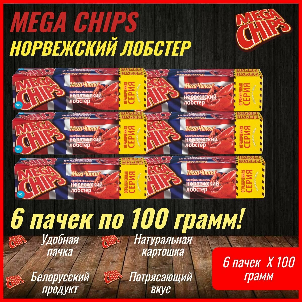 Купить Мегачипсы Mega Chips со вкусом Норвежский Лобстер, картофельные, 6 штук по 100 г
