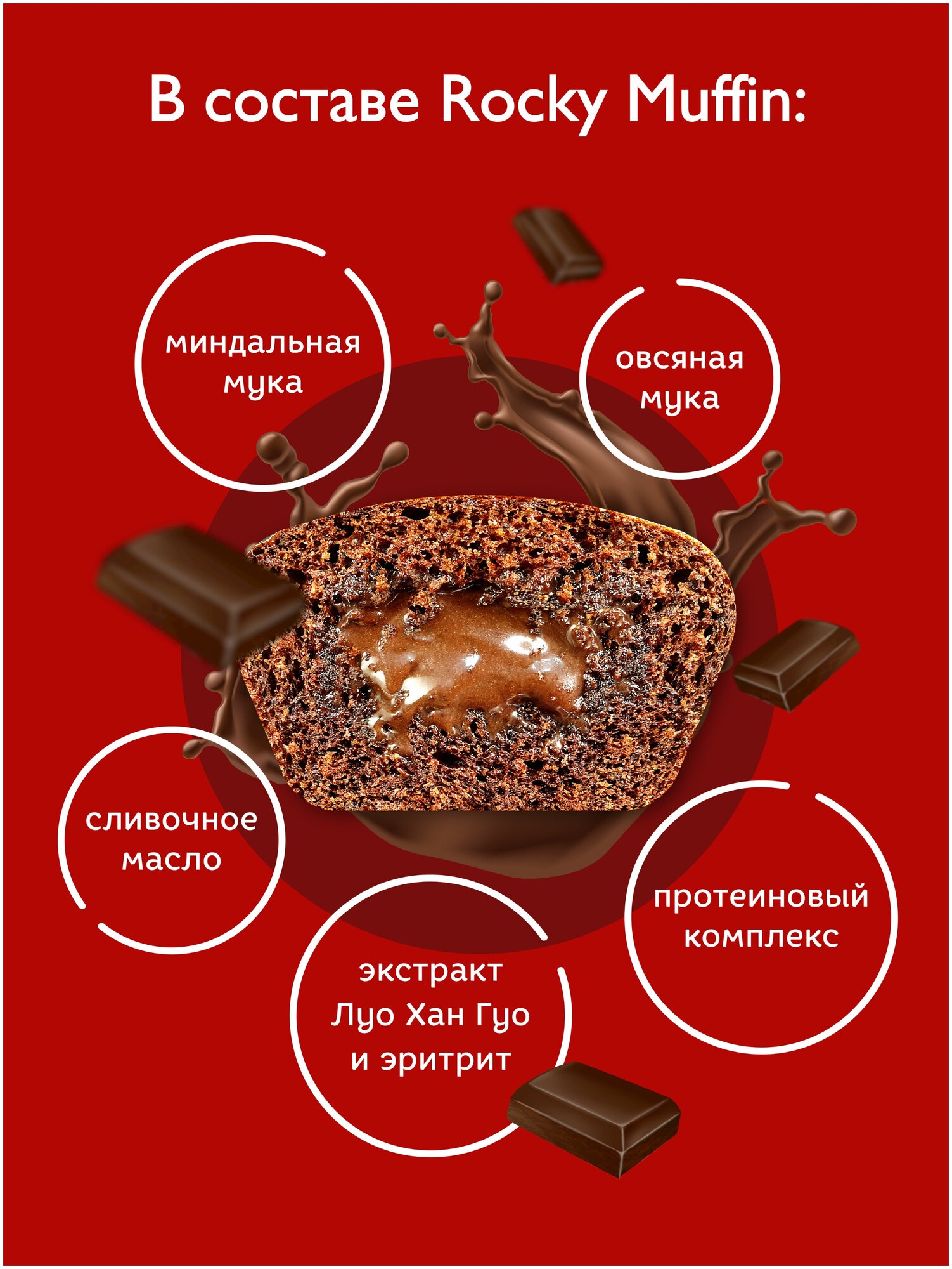 | Состав | меланж, протеиновый комплекс (концентрат молочного белка, белок яичный), наполнитель полидекстроза, вода питьевая, миндальная мука, изюм, масло сливочное (сливки пастеризованные), влагоудерживающий агент глицерин, какао-порошок, натуральный пребиотик инулин, овсяная мука, сухое молоко ,начинка шоколадная (наполнитель полидекстроза, подсластитель эритрит, натуральный пребиотик инулин, влагоудерживающий агент глицерин, какао-порошок, молоко сухое, вода питьевая, загуститель гуммиарабик, экстракт Монах фрукта, масло сливочное (сливки пастеризованные), эмульгатор лецитин, ароматизатор натуральный шоколад ), эмульгатор лецитин, разрыхлитель сода пищевая, экстракт Монах фрукта, соль, консервант сорбат калия, регулятор кислотности лимонная кислота, ароматизаторы натуральные (шоколад, ваниль ) |