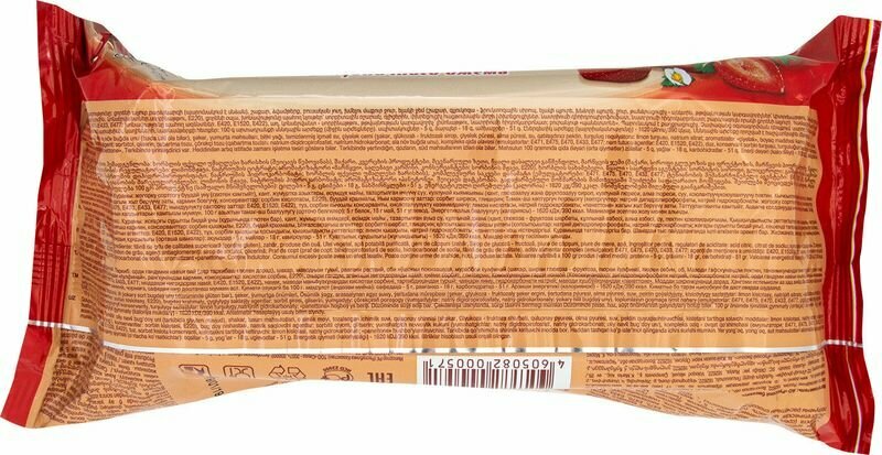 | Состав | мука пшеничная высшего сорта (содержит глютен), сахар, продукты яичные, масло растительное, вода питьева очищенная, джем клубничный (сахар, сироп глюкозно-фруктозный, глюкоза, фруктоза), пюре клубничное, пюре яблочное, вода, загуститель пектин, регуляторы кислотности: лимонная кислота, цитрат натрия; ароматизатор клубника, краситель кармин, консерванты: сорбиновая кислота, Е220) крахмал пшеничный, влагоудерживающие агенты: сорбитовый сироп, глицерин; разрыхлитель пекарский порошок (разрыхлители: дигидропирофосфат натрия, гидрокарбонат натрия, мука пшеничная высшего сорта), комплексная пищевая добавка (эмульгаторы: Е471, Е475, Е470, Е433, Е477; влагоудерживающие агенты: Е420, Е1520, Е422), соль, консервант сорбиновая кислота, регуляторы кислотности: лимонная кислота, гидрокарбонат натрия, ароматизатор панеттоне |