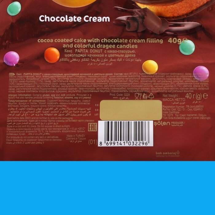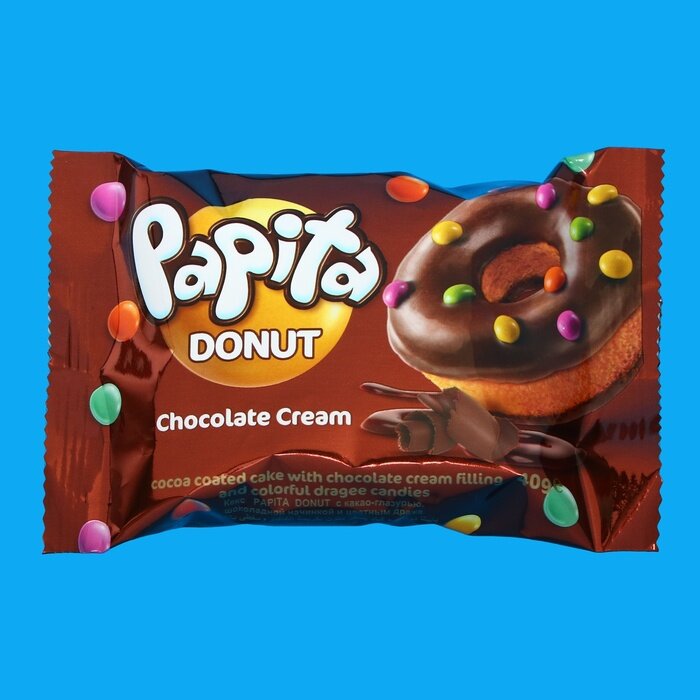 Кекс "PAPITA DONUT", с какао глазурью, шоколадной начинкой и цветным драже 40 г(3 шт.) интересное:
